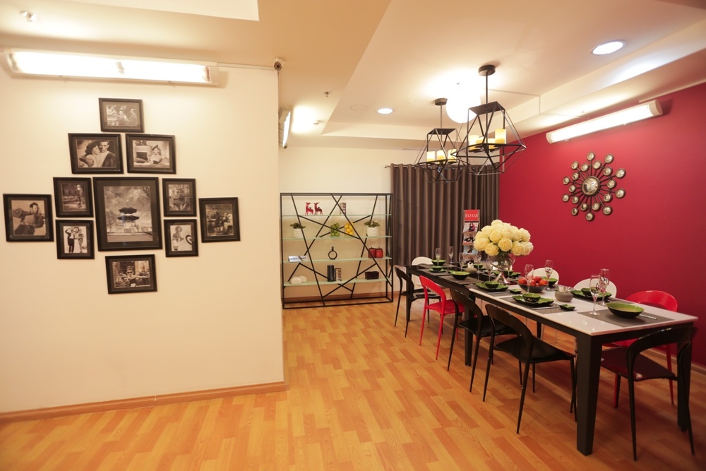 Phòng ăn của các chân dài mùa 6 có màu đỏ làm điểm nhấn, tạo không gian ấm cúng, gắn kết các thí sinh trong 3 tháng chung sống.
