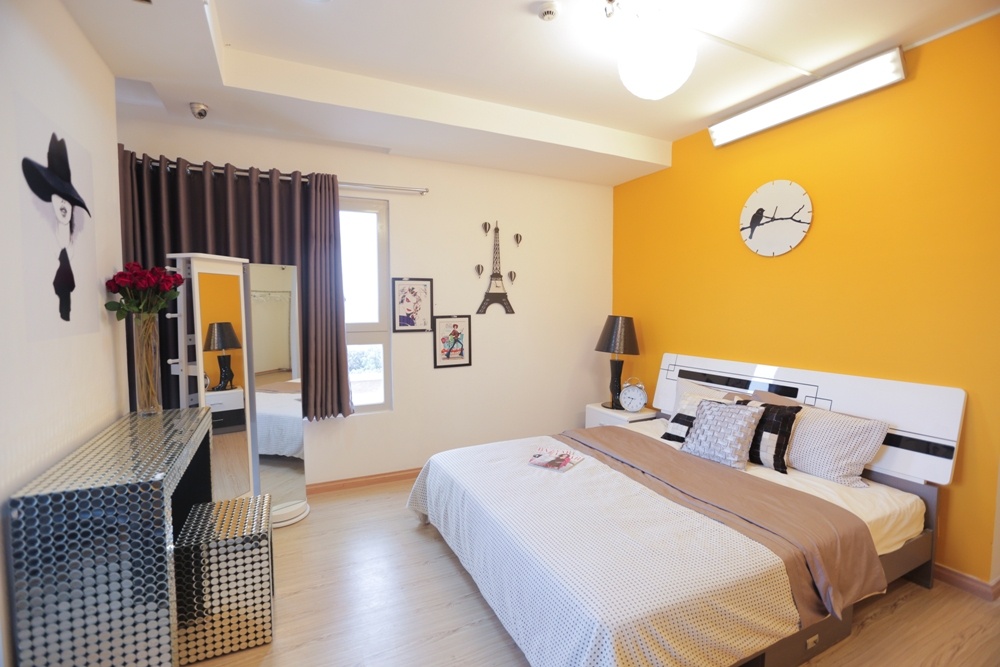 Một phòng ngủ khác có tông màu bắt ánh nhìn không kém. Mỗi gian phòng đều được đặt bộ bàn ghế đôi cạnh ban công lãng mạn.