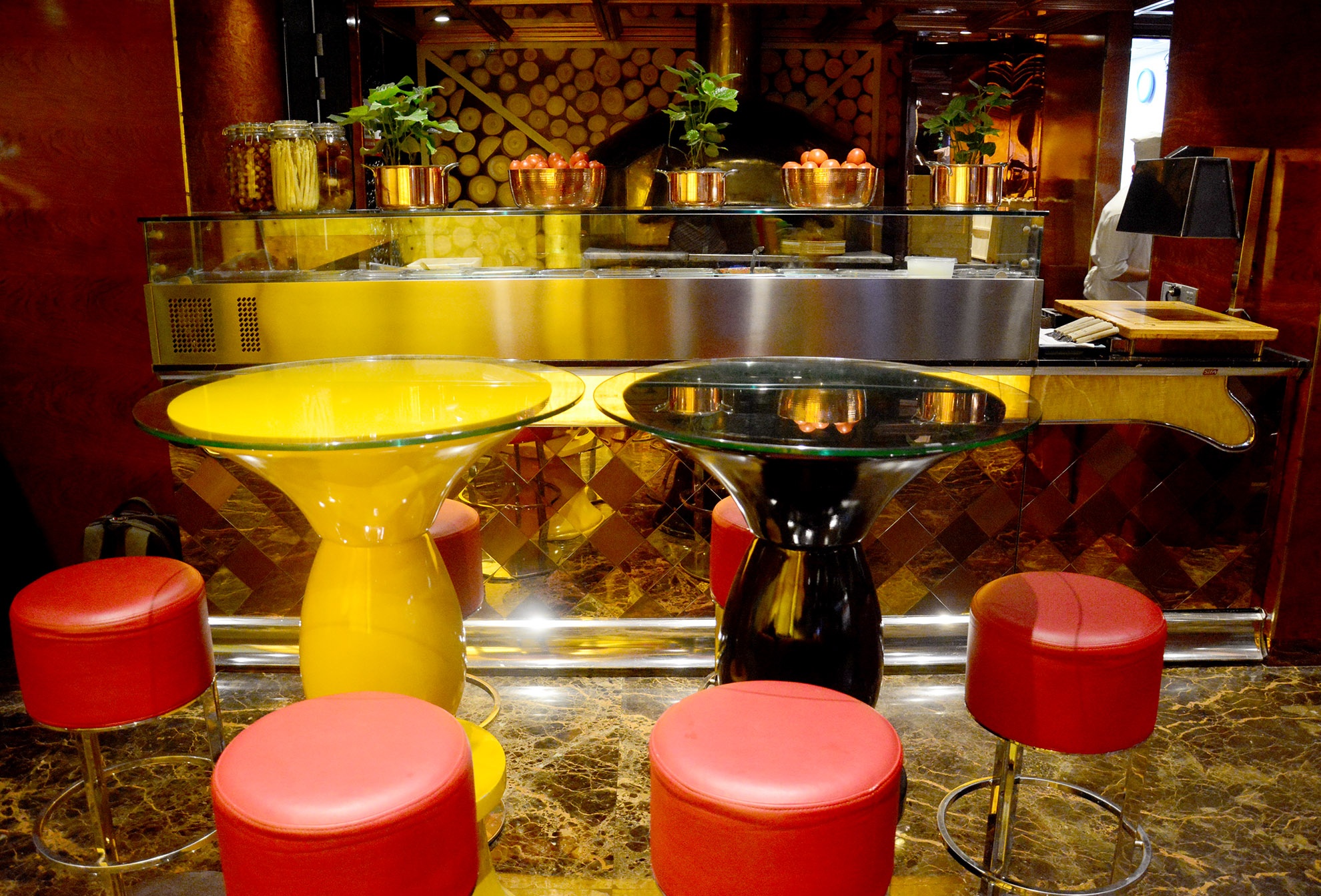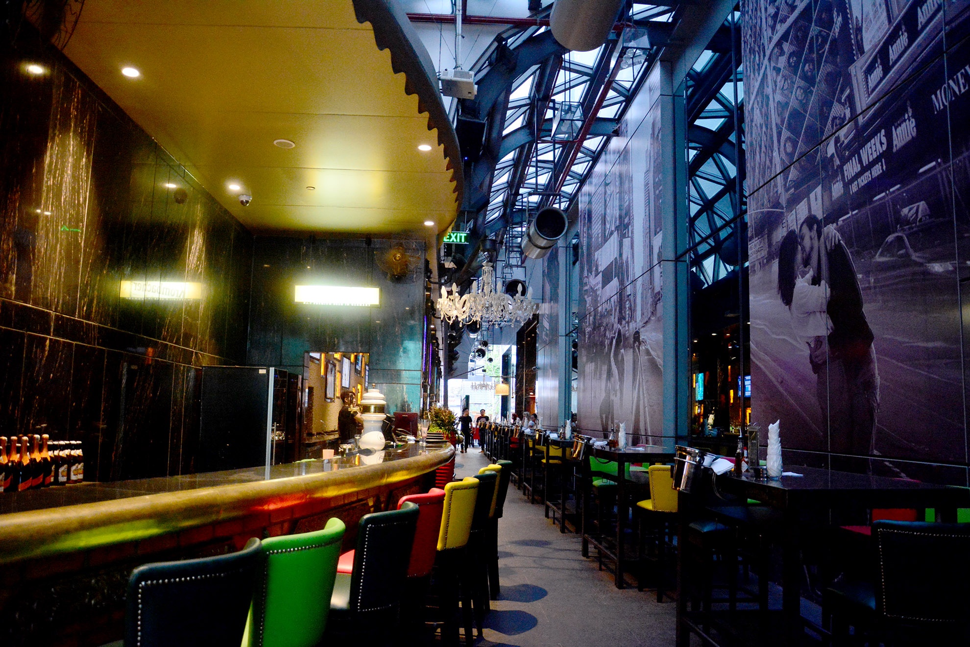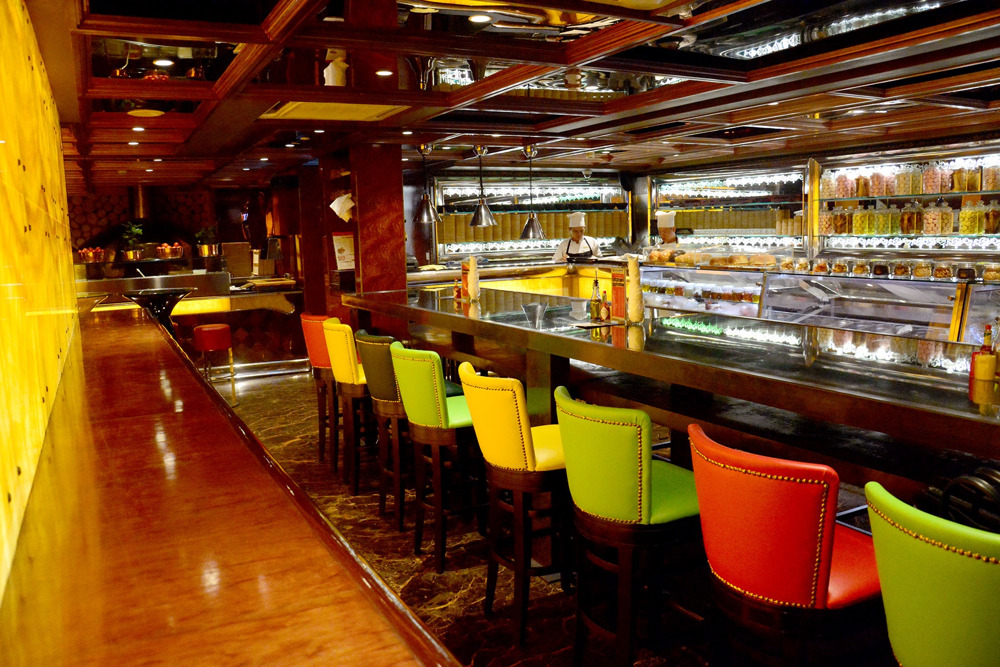 Dãy bar khảm đá cẩm thạch chia thành 6 quầy dài 48 m, nối từ điểm đầu đến điểm cuối nhà hàng. |