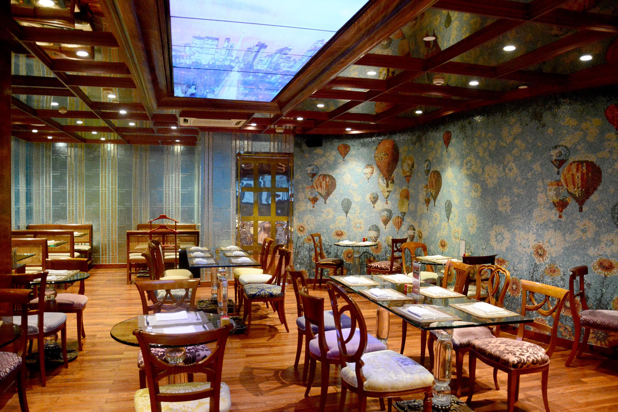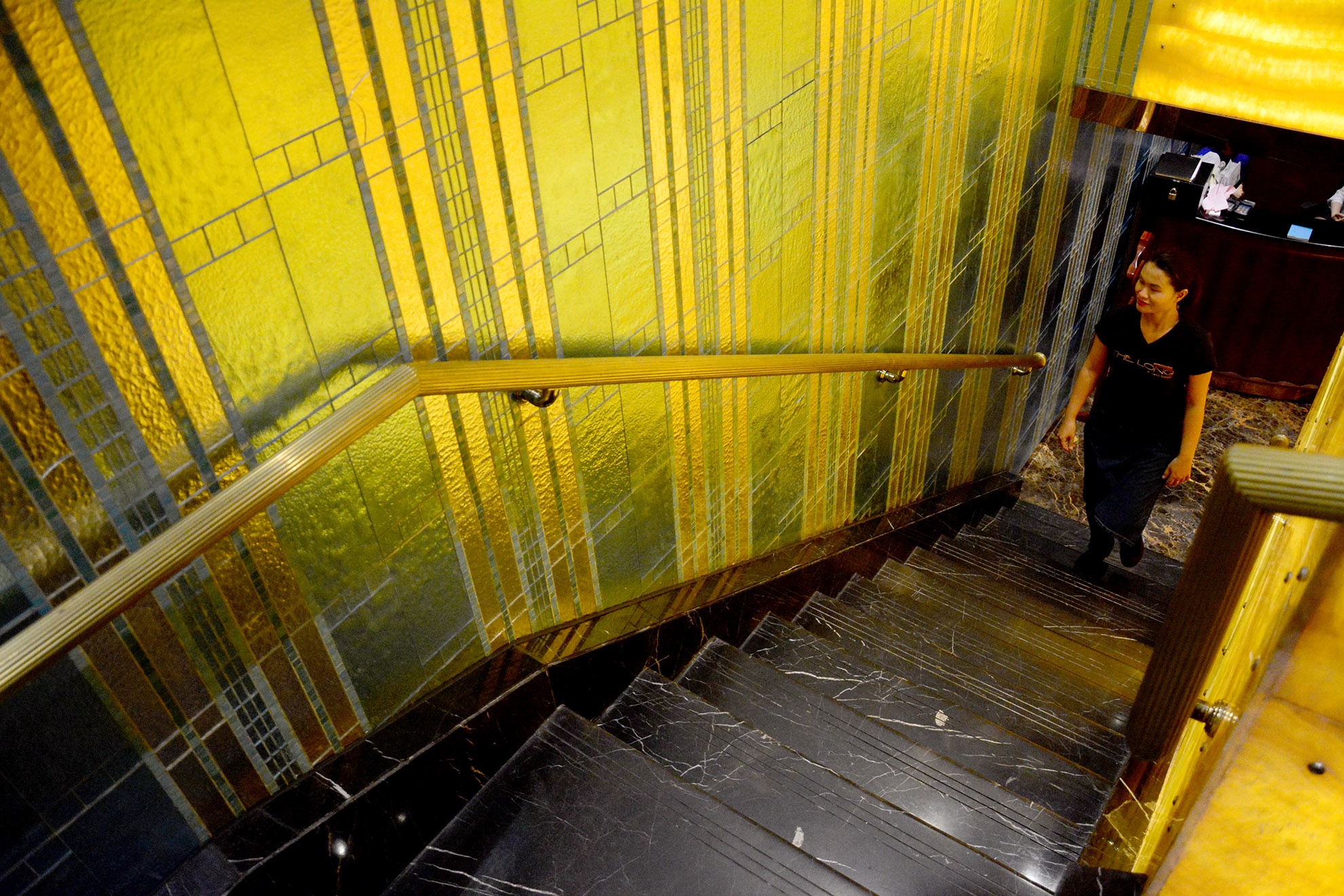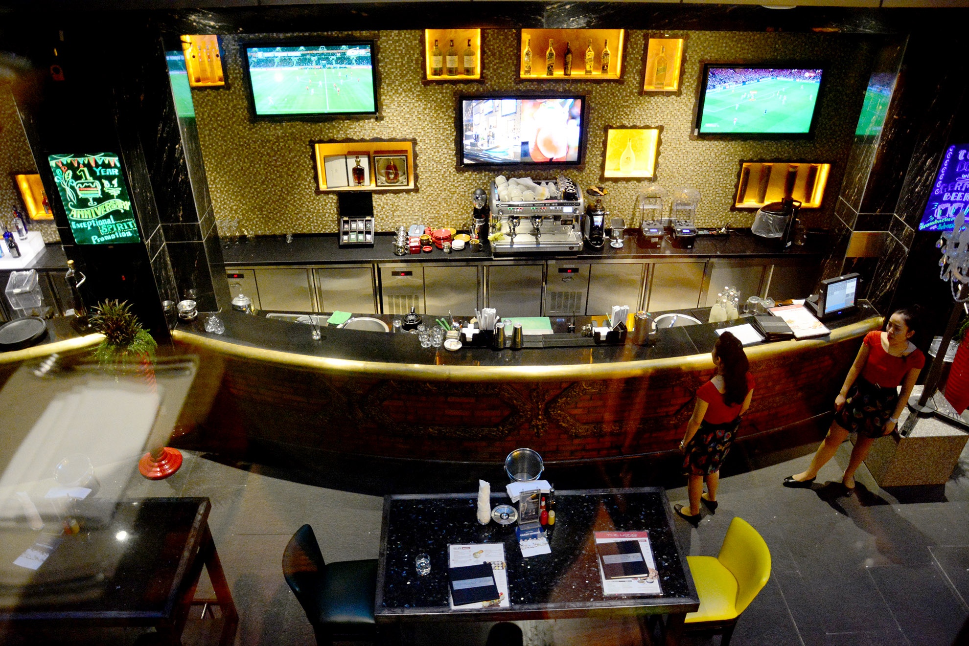 Dãy bar khảm đá cẩm thạch chia thành 6 quầy dài 48 m, nối từ điểm đầu đến điểm cuối nhà hàng. |