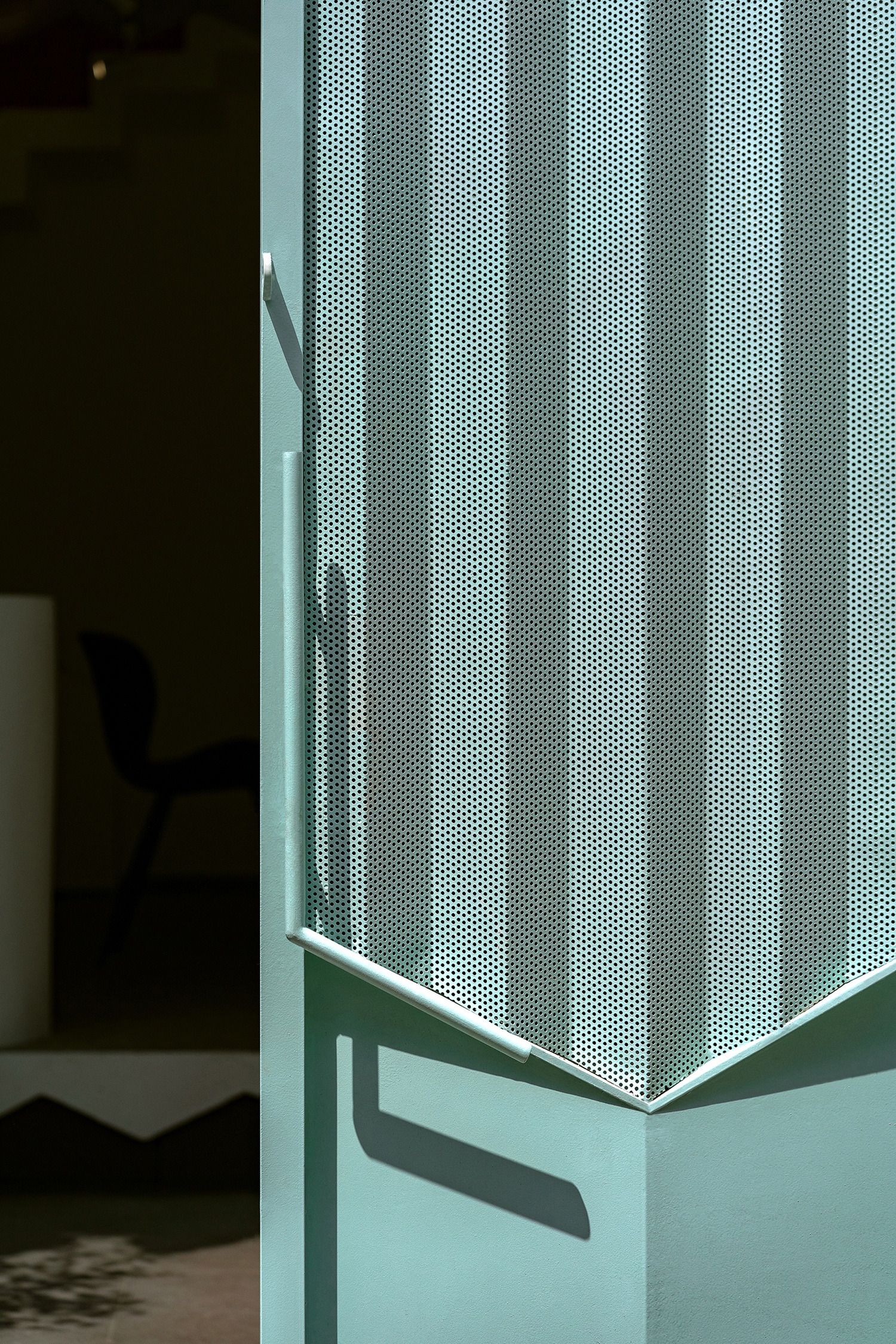 Các nếp gấp và đường nét của hình tam giác được sử dụng từ những chi tiết lớn như: bê tông trần, cửa, hàng rào và đi vào cả những chi tiết nhỏ như: bát cửa, tay nắm,... để tạo ra được một bộ thiết kế riêng cho công trình.