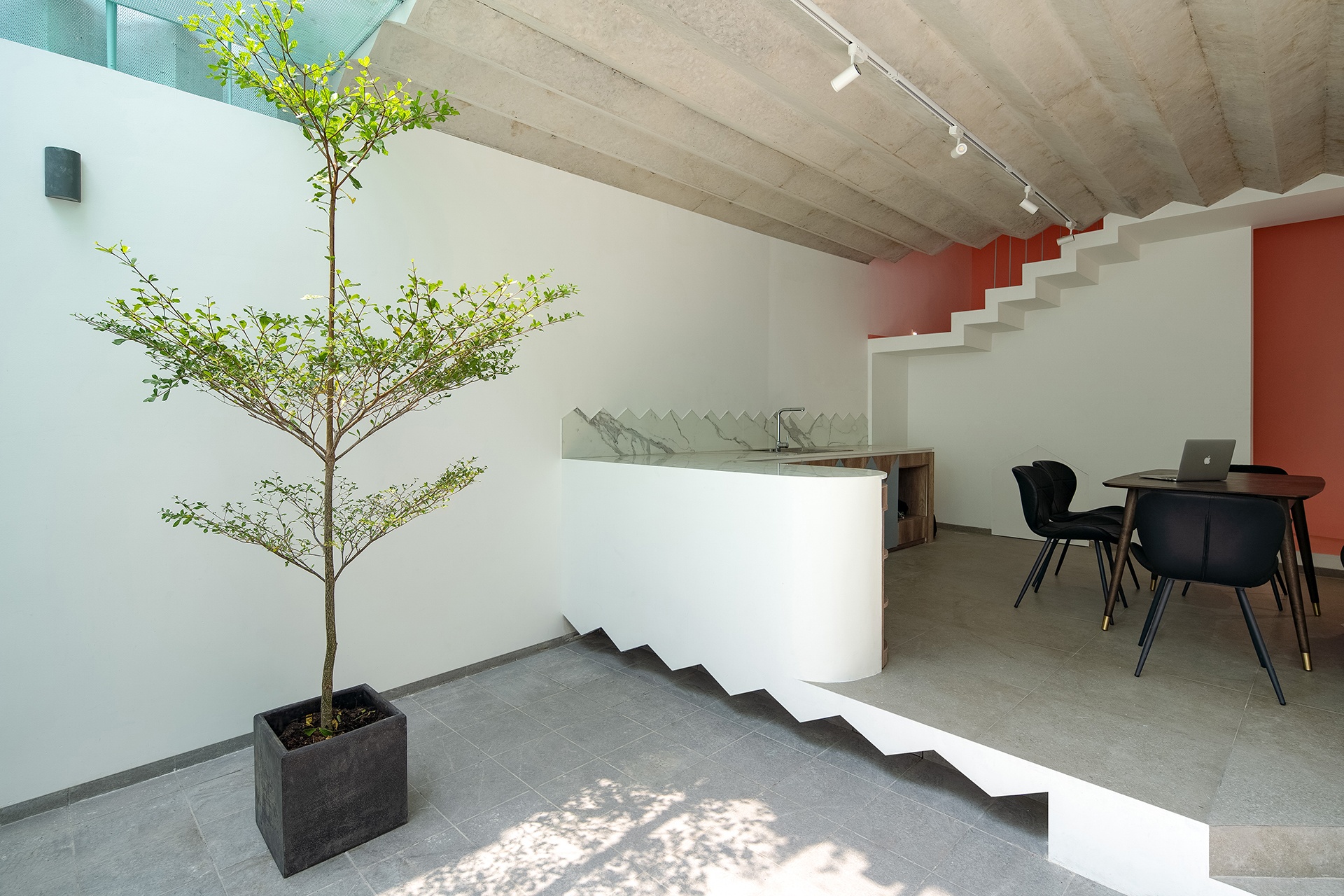 Ở vị trí tầng trệt chỉ có gia đình sử dụng và không có nhu cầu tiếp khách nên khu vực bếp và bàn ăn được bố trí ở đây. Khi buôn bán, nhà bếp có thể thay đổi công năng trở thành quầy bar pha chế hoặc chế biến đồ ăn một cách dễ dàng.