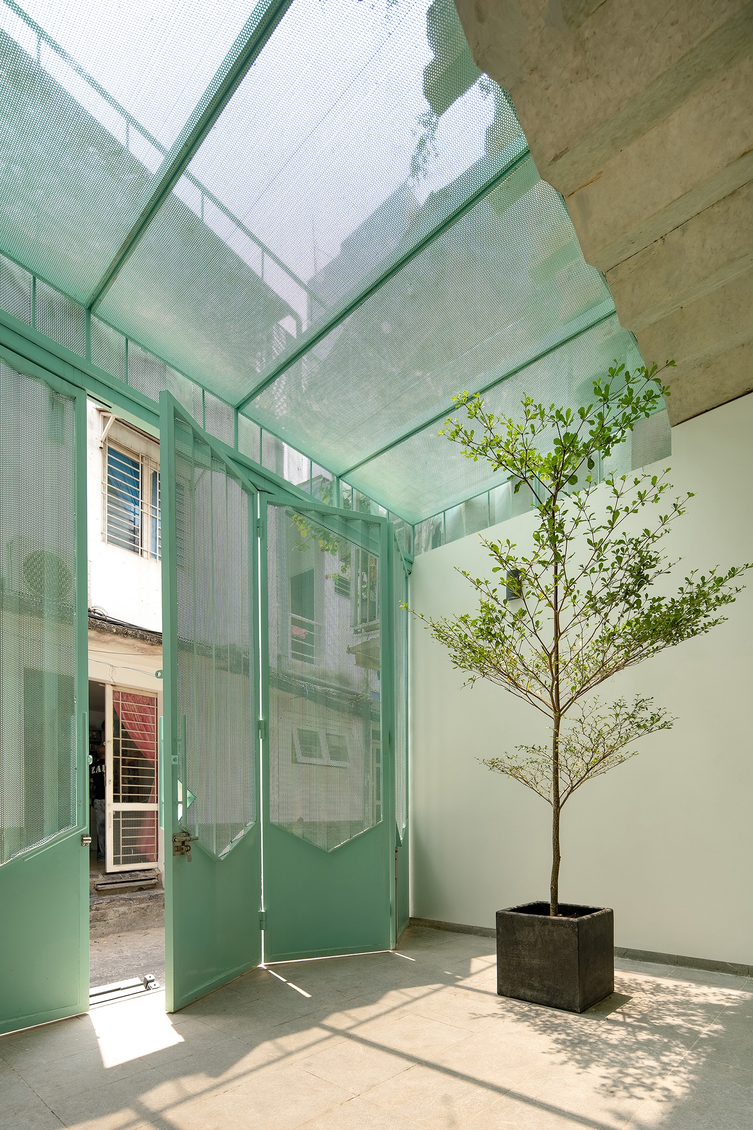 Bên cạnh đó, khu vực ban công phòng, kiến trúc sư lựa chọn chất liệu sàn kính và sắt lỗ để đưa được ánh sáng xuống không gian sân phía dưới. Ý tưởng này còn giúp lọc bớt ánh sáng trực tiếp chiếu vào sân nhà.