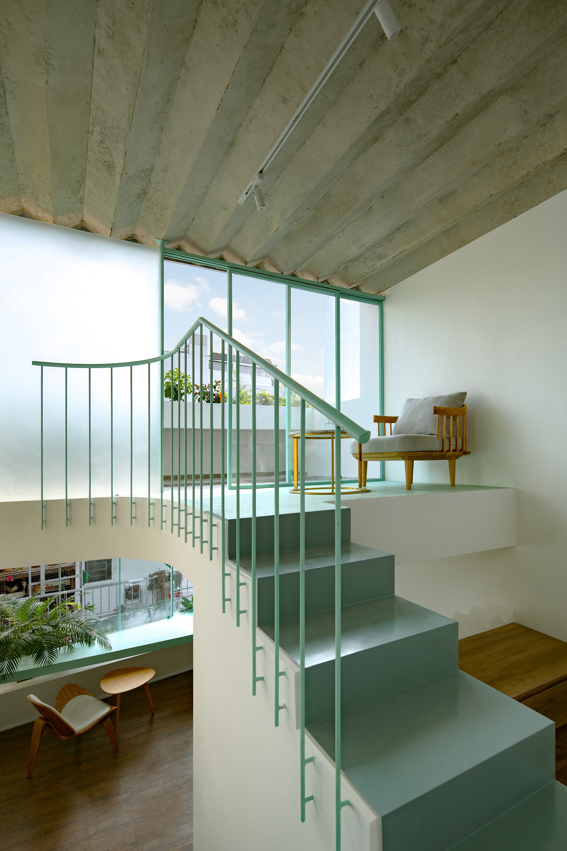 Ở những khu vực có diện tích nhỏ như lòng thang, nhóm thiết kế chỉ sử dụng duy nhất một tone màu nhằm tạo ra một khối liên kết và hài hòa hơn khi nhìn vào.