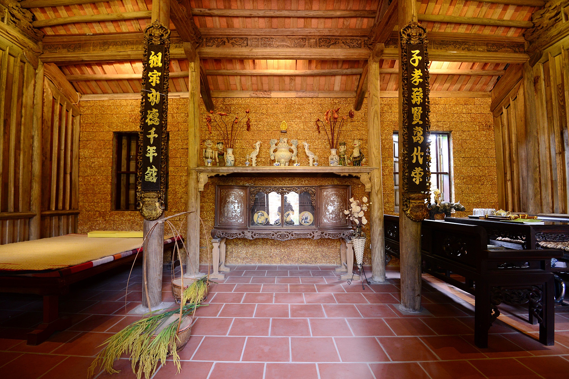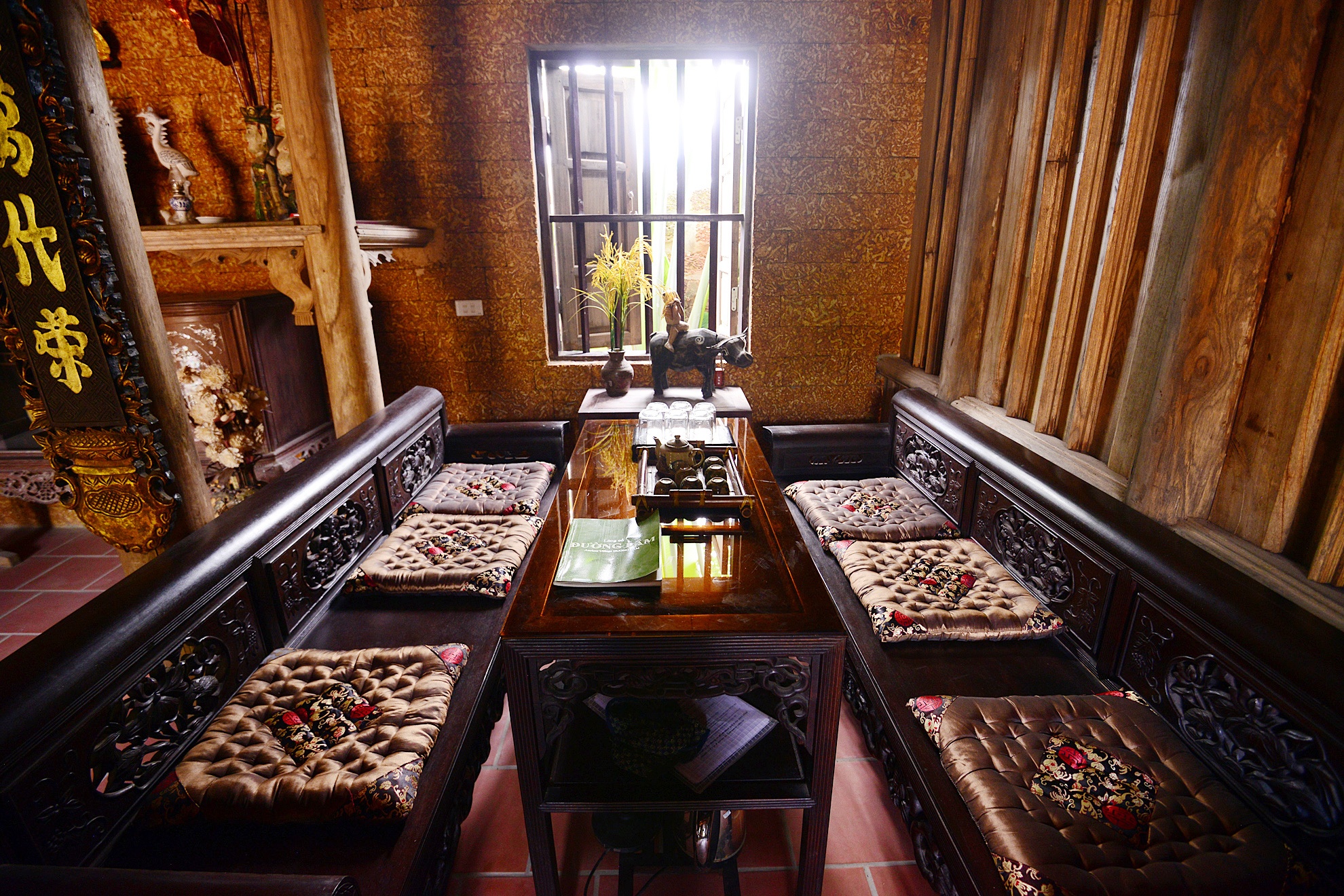 Ngôi nhà năm gian, tường đá ong, nền gạch, trang trí sập gụ, tủ chè phục vụ các du khách có nhu cầu nghỉ cuối tuần, tận hưởng không khí miền quê xưa tại làng cổ Đường Lâm.
