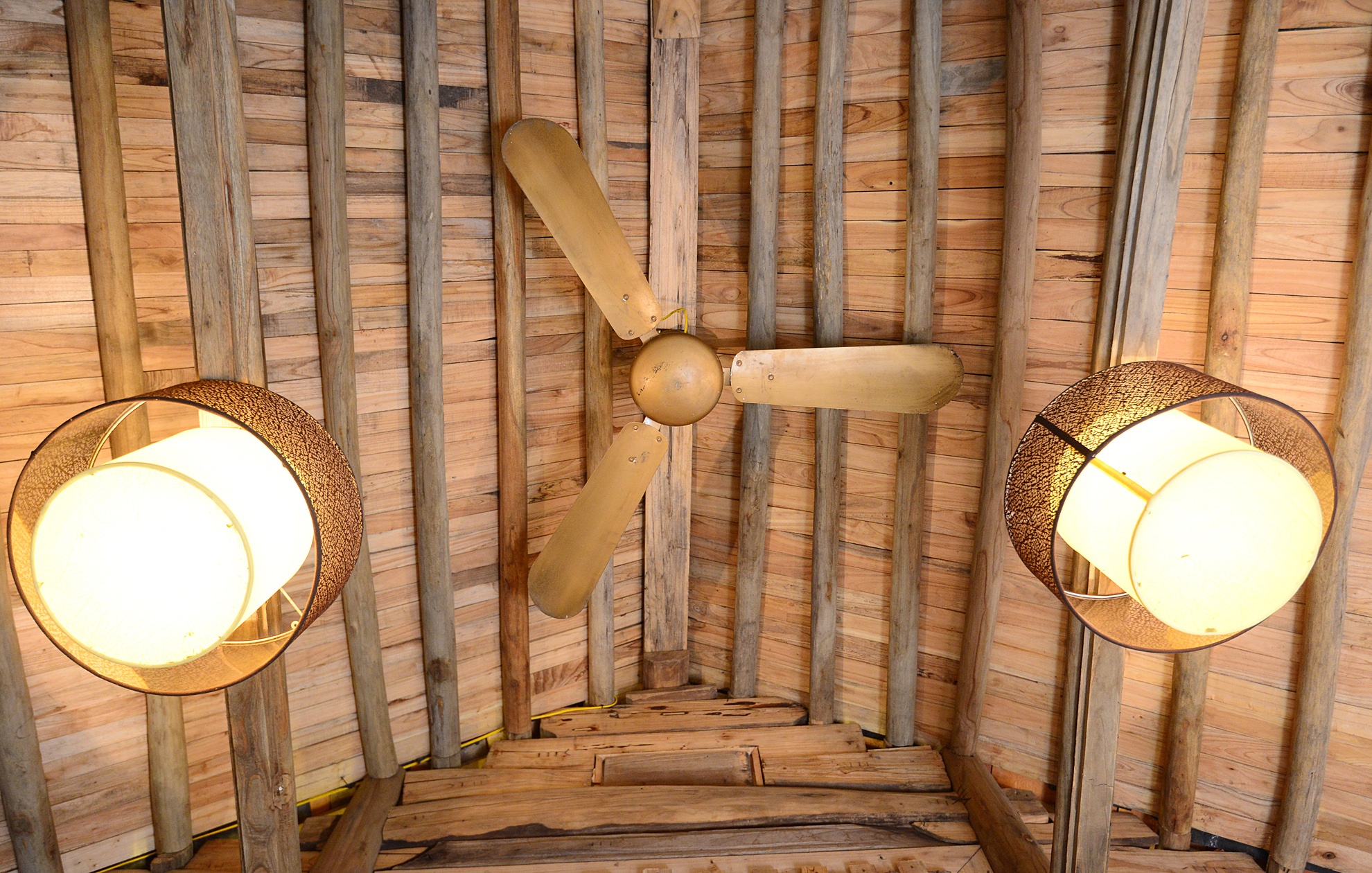| Chiếc quạt trần được sơn cùng màu gỗ cùng bộ đèn trang trí, có chút hiện đại nhưng hữu ích khi trời nóng. |