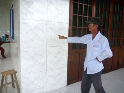 | Ông Nguyễn Văn Hai chỉ nơi bọn côn đồ dội bom xăng vào làm bể gạch men ốp tường. |