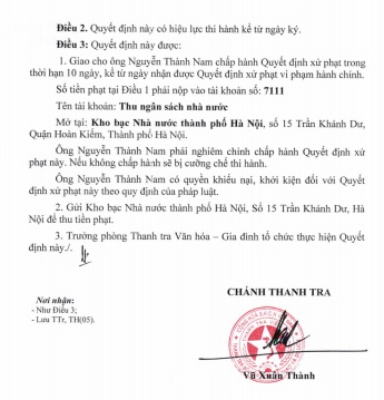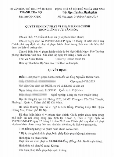 Kết thúc buổi làm việc, Thanh tra Bộ đã lập biên bản xử phạt vi phạm hành chính Nguyễn Thành Nam với mức phạt 10 triệu đồng. Đây là mức phạt cao nhất đối với hành vi "Chiếu phim chưa được phép phổ biến tại nơi công cộng" được quy định tại khoản 3 điều 6 của nghị định 158/ NĐ-CP.