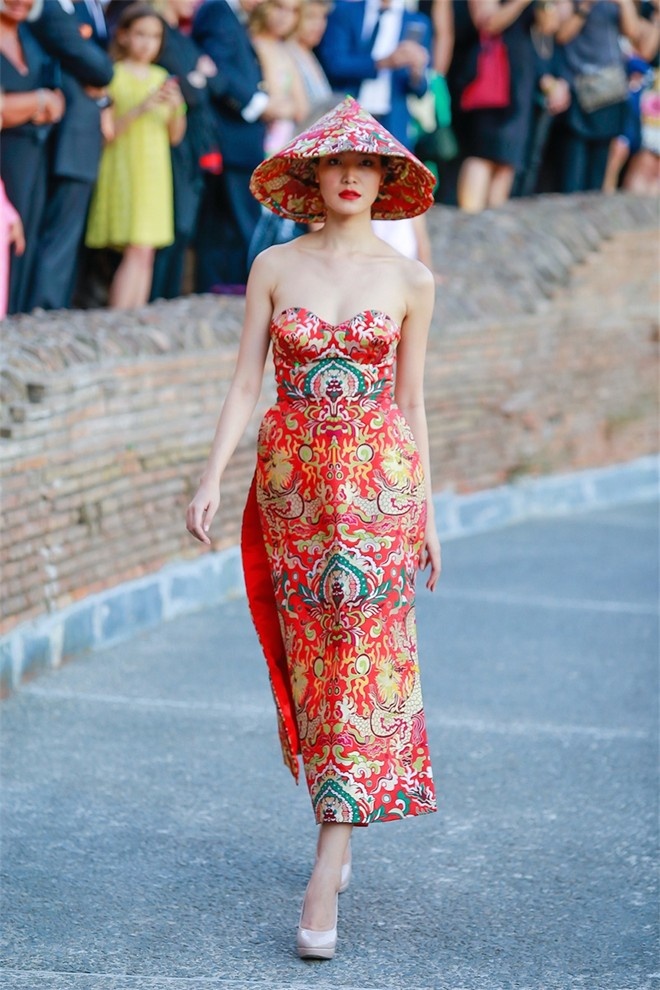 NTK Thủy Nguyễn giới thiệu bộ sưu tập xuân hè 2015 mang đậm nét truyền thống Việt tại chương trình Vietnam Culture Day, diễn ra tại bảo tàng cổ Mercati Di Traiano, Italy ngày 25/6. Hoa hậu Việt Nam 2008 - Thùy Dung diện bộ áo dài cách tân, họa tiết rồng phượng thêu tinh tế trên nền vải gấm làm vedette.