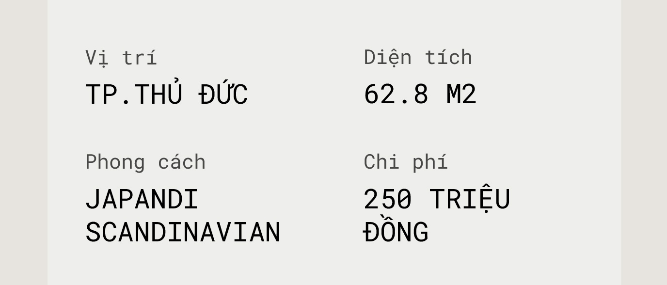 Kinh phí ban đầu Ly đặt ra cho việc thiết kế và sửa sang căn hộ rơi vào tầm 270 triệu đồng đổ xuống. Nhờ kinh nghiệm làm nghề và sự chuẩn bị kĩ càng nên tổng kinh phí mà cô đầu tư vào căn hộ thấp hơn dự tính ban đầu, chỉ hết 250 triệu đồng.