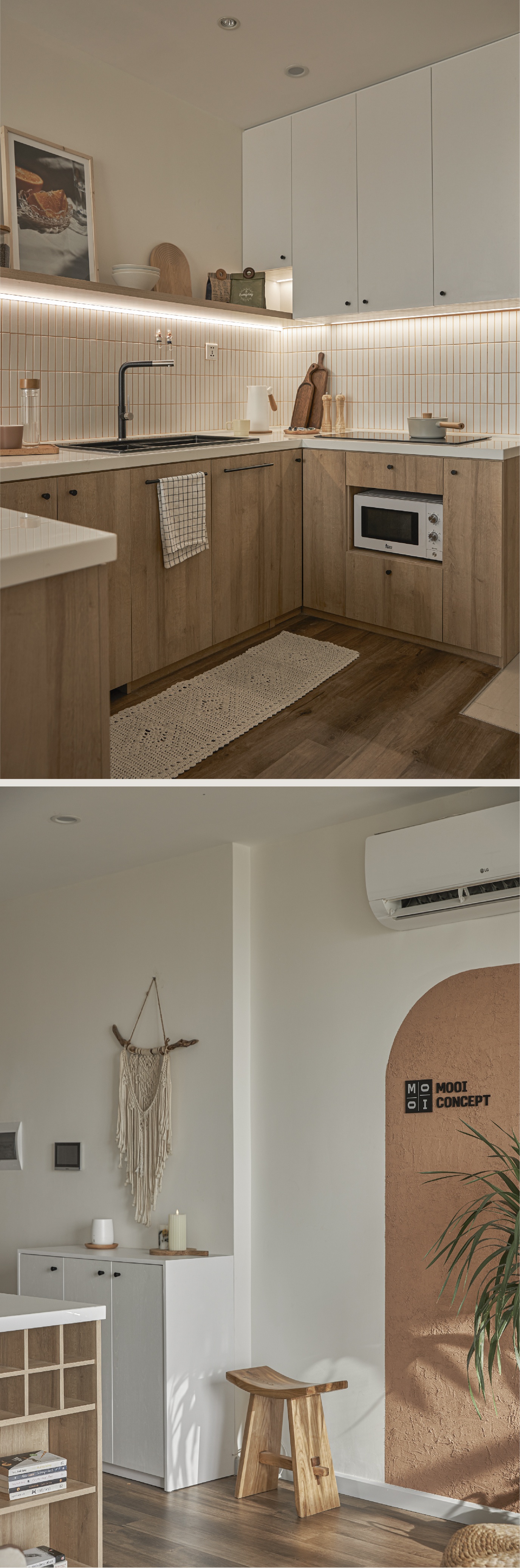 Với phong cách Japandi nên khu vực này Ly đã chọn tông màu gỗ sồi và trắng để làm chủ đạo.
