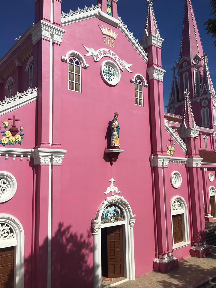 | Chỉ cần đứng vào khung hình với phông nền đằng sau là màu "hồng mộng mơ" của thánh đường uy nghi, bạn dễ dàng có bức ảnh sống ảo đầy khác biệt, hút nhiều lượt yêu thích trên mạng xã hội. Ảnh: Giáo Xứ Nghĩa Thành, Huyền Dương. |