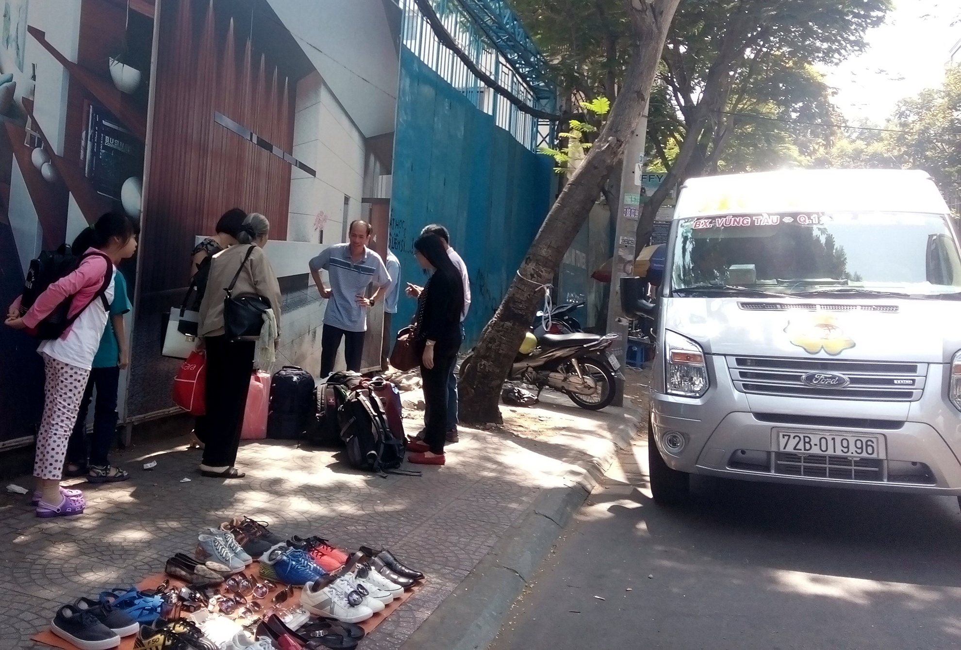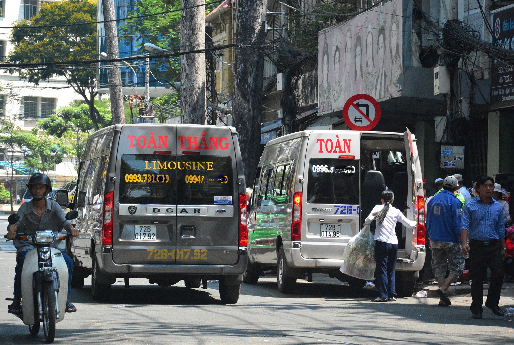 Thế nhưng, theo ghi nhận của phóng viên trong 2 ngày qua, các doanh nghiệp vận tải có trụ sở trên 2 tuyến đường này vẫn tổ chức đón, trả khách bình thường. Trong ảnh: Hai xe dán logo của doanh nghiệp Toàn Thắng cùng ghé trước trụ sở trên đường Nguyễn Thái Bình để nhận khách trong sáng 19/2. |