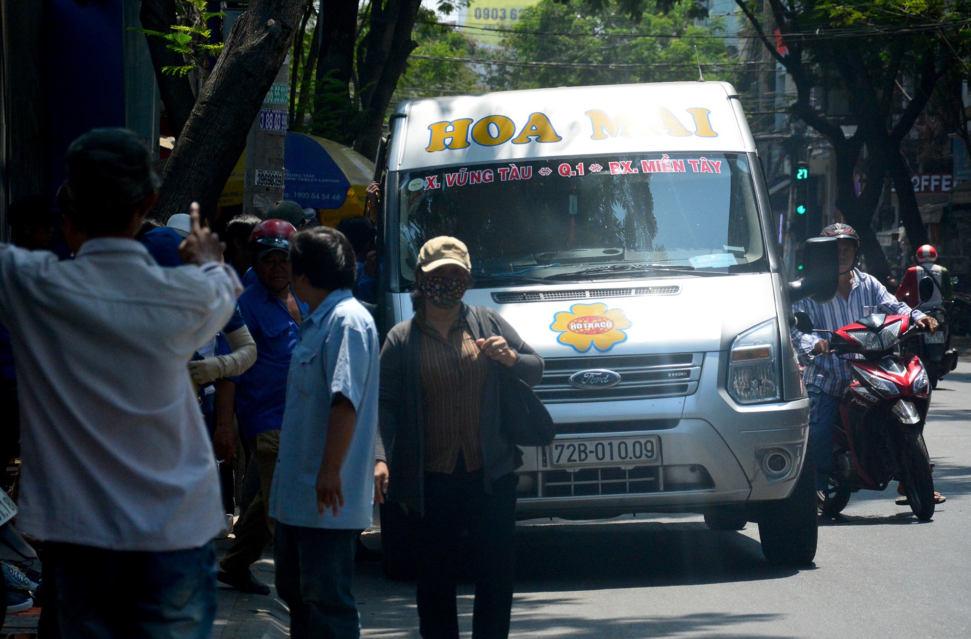 | Một xe khác dán logo doanh nghiệp Hoa Mai dừng chớp nhoáng trong sáng 19/2 gần đường Lê Thị Hồng Gấm để trả khách. |