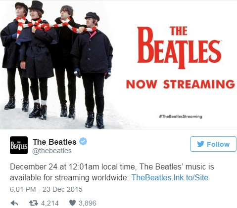 Tối 23/12, trang Twitter chính thức của The Beatles gây chú ý khi thông báo từ 00h01' ngày 24/12, nhạc của The Beatles sẽ chính thức xuất hiện trên các dịch vụ phát nhạc online khắp thế giới.
