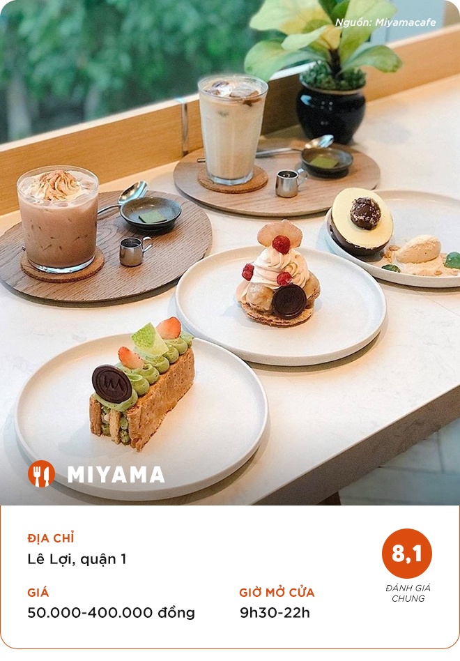 Là nhà hàng kết hợp phục vụ cà phê, bánh ngọt, cocktail, Miyama nổi tiếng bởi các món ngon lạ cùng cách bài trí đẹp mắt. Đồ tráng miệng mùa Giáng sinh bạn có thể thử qua là strawberry shortcake, cheese souffle, matcha mille crepes... Set bánh sừng trâu, trà hoặc cà phê có giá 98.000 đồng cũng là gợi ý lý tưởng cho tín đồ hảo ngọt.