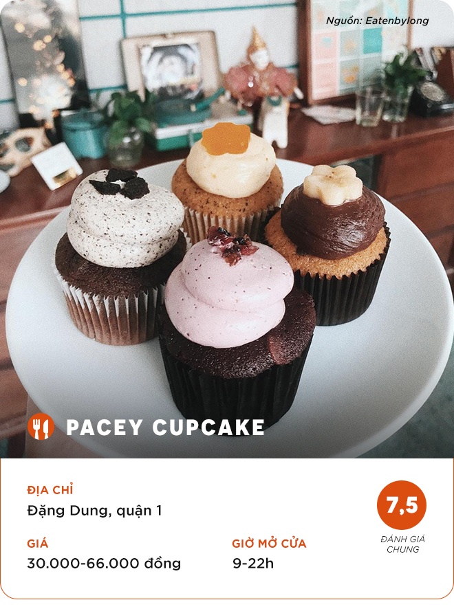 Là tiệm chuyên về cupcake đầu tiên ở Sài thành, Pacey Cupcakes thu hút các tín đồ hảo ngọt với hơn 40 vị bánh như chocolate, trà xanh, sầu riêng, chuối, dâu... Quán nằm ở trung tâm quận 1, không gian nhỏ và được chia làm hai tầng.
