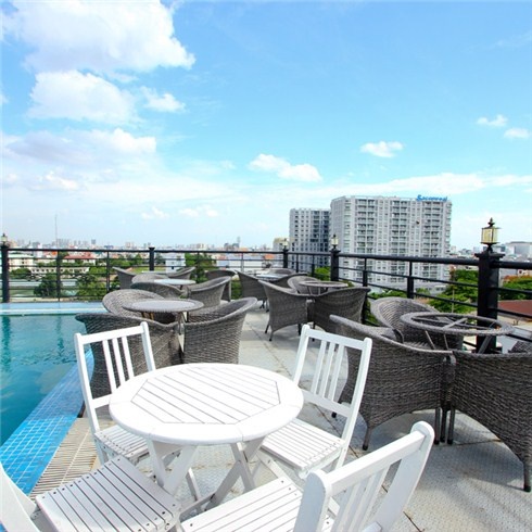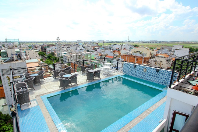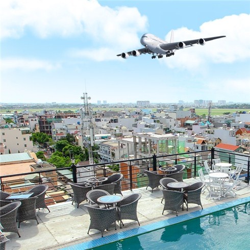 Các tầng bên dưới đã tuyệt, tầng thượng với hồ nước ở giữa càng thư giãn, dễ chịu. Nằm cạnh sân bay Tân Sơn Nhất, nên khu vực tầng thượng của quán là nơi bạn có thể ngắm những thay đổi đến từng phút của nơi này.