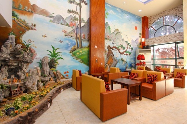 Dù ngồi tầng nào, bạn cũng sẽ cảm nhận được cái xanh mát đến từ những bức tranh phong cảnh trên tường, tiếng róc rách của những dòng thác nhỏ, cái ôn hòa của hòn non bộ hay hoa tươi rải rác khắp quán.