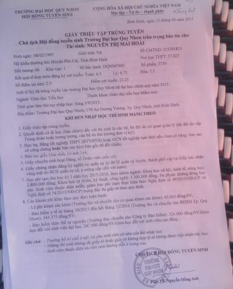 | Giấy báo trúng tuyền của trường Đại học Quy Nhơn gửi cho em Hoài. |