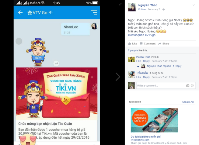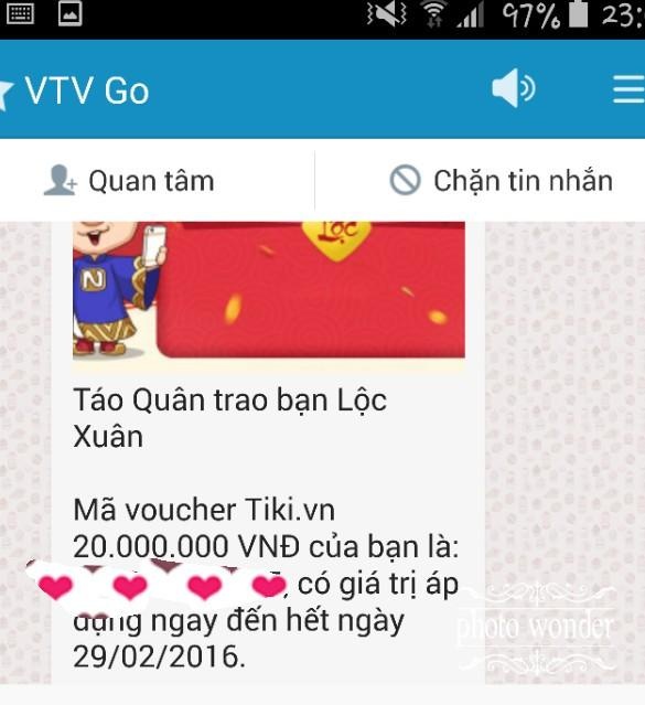 Chị kể, trước thềm năm mới, chị cùng gia đình đang ngồi ăn cơm và xem Táo quân 2016 thì thấy thông tin đăng nhập vào Zalo để nhận lì xì từ chương trình "Lộc Táo quân". “Gần 11h, tôi nhấn chọn ‘NhanLoc’ trên Zalo, chẳng hiểu thế nào mà may mắn quá, tin nhắn báo về là trúng voucher mua hàng trên Tiki đến 20 triệu đồng. Hai vợ chồng lúc đầu không tin, sau kiểm tra biết chính xác thì hạnh phúc quá”, nữ khán giả may mắn tại Hà Nội chia sẻ.