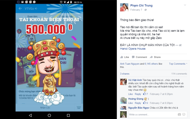 | Ngay cả Táo Xã hội cũng có lộc từ Zalo và VTVGo. |