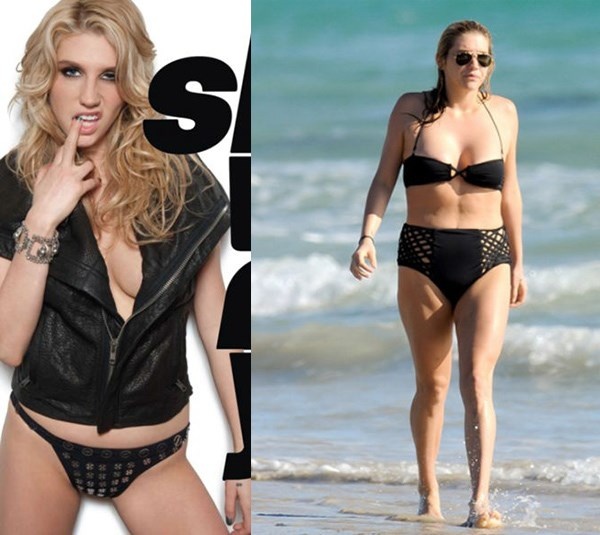| Cũng như Kelly Blook, nữ ca sĩ Kesha cũng gặp "hoàn cảnh" tương tự với vòng eo to quá khổ và buộc phải nhờ đến kỹ thuật photoshop mỗi lần xuất hiện trên tạp chí. |