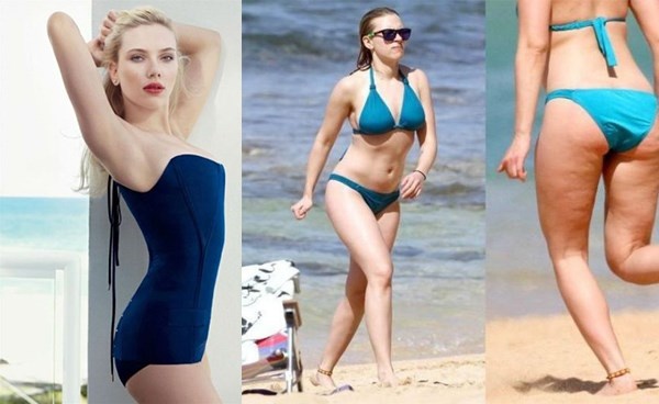 | Vòng eo và cặp đùi ngấn mỡ của Scarlett Johansson ngoài đời đối lập với vẻ hoàn hảo của photoshop. |