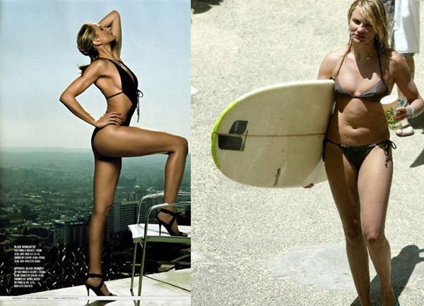 | Cameron Diaz có một vóc dáng thô, số đo 3 vòng mất cân đối và nếp nhăn trên da đối lập hoàn toàn với vẻ đẹp gợi cảm trên tạp chí. |