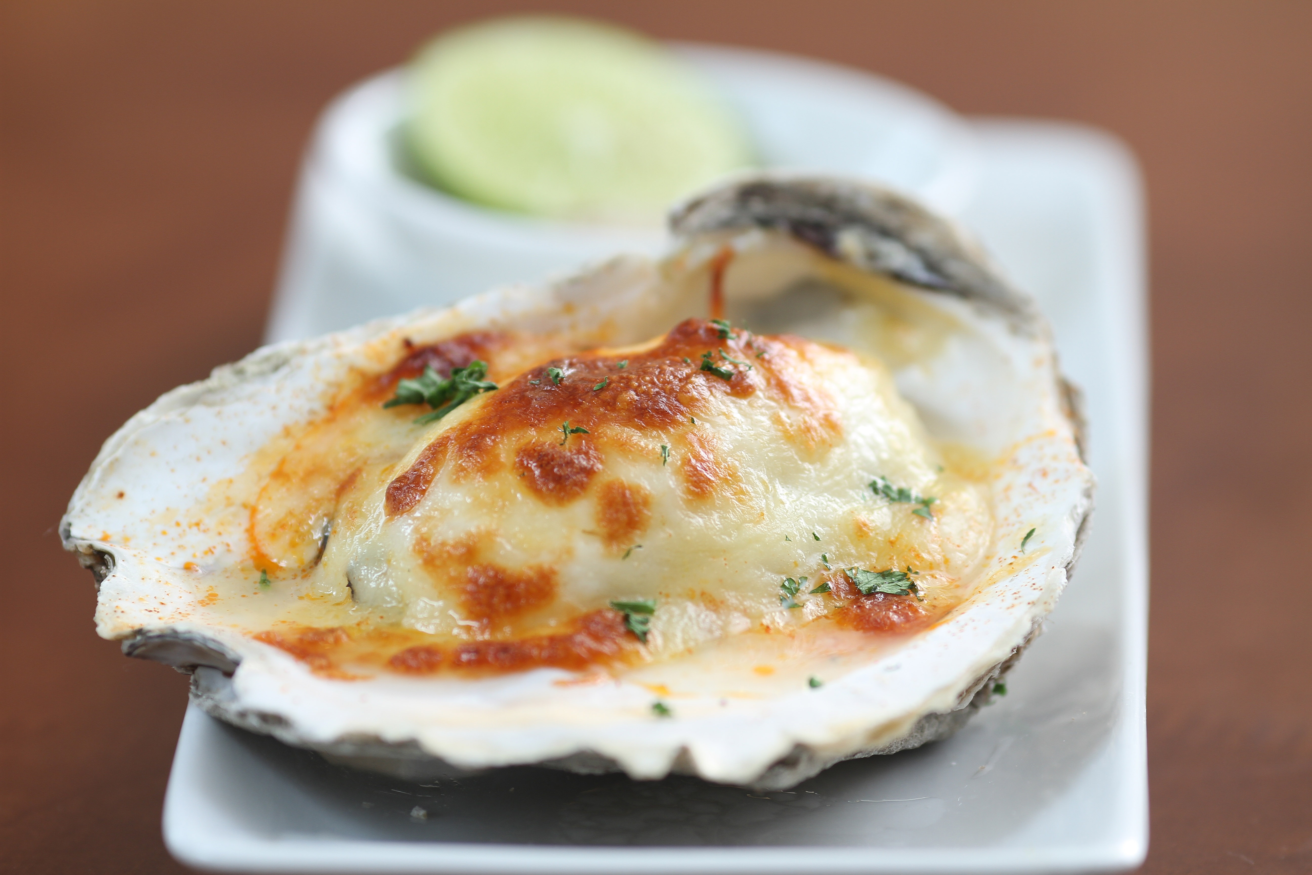 Đặt hàu vào dĩa nướng, cho xốt sữa tươi, phô mai và ớt bột paprika lên trên.
