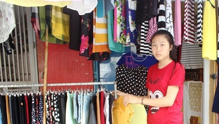 | Vũ Thị Tuyến đang bán quần áo thuê ở Hà Nội để kiếm tiền ăn học. |