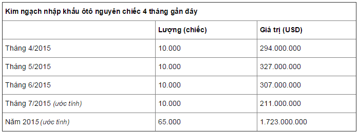Cũng theo báo cáo của cơ quan thống kê quốc gia, tổng kim ngạch nhập khẩu ôtô CBU giai đoạn 7 tháng năm 2015 ước đạt 65.000 chiếc và trên 1,72 tỷ USD, tăng 107,7% về lượng và tăng 154,4% về giá trị so với cùng kỳ năm ngoái.