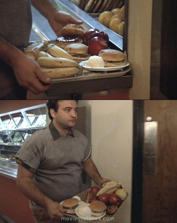 | Trong bộ phim Animal House, ở cảnh quay tại một tiệm ăn, nhân vật Bluto (John Belushi) đang bê đĩa thức ăn gồm bánh ngọt và trái cây trên tay. Ban đầu,vị trí các quả chuối nằm ở tay phải nhưng sau nháy mắt đã chuyển sang tay trái. Chi tiết này khá nhỏ không phải ai cũng chú ý nhận ra. |