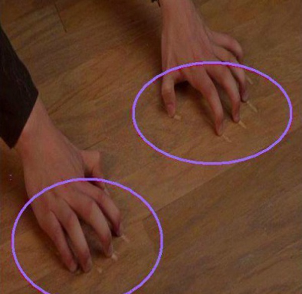 | There's Something About Mary (1998) của cô đào Cameron Diaz có một cảnh quay khi chú chó Puffy kéo nhân vật Ted (Ben Stiller) lê la trên sàn nhà, móng tay của Ted trên sàn gây ra các vết cào xước. Nhưng nếu nhìn kỹ, khán giả sẽ nhận ra những vết xước này đã có sẵn và Ben Stiller chỉ việc đặt bàn tay vào đó. |