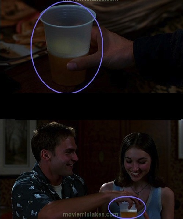 | Cốc bia của anh chàng Stifler (Seann William Scott) đưa cho cô gái trong bộ phim hài tình cảm hạng R American Pie (1999) có sự thay đổi rõ rệt về số lượng. Ban đầu Stifler rót nửa cốc, nhưng ở cảnh sau, số bia đã tăng lên 3/4 cốc. |