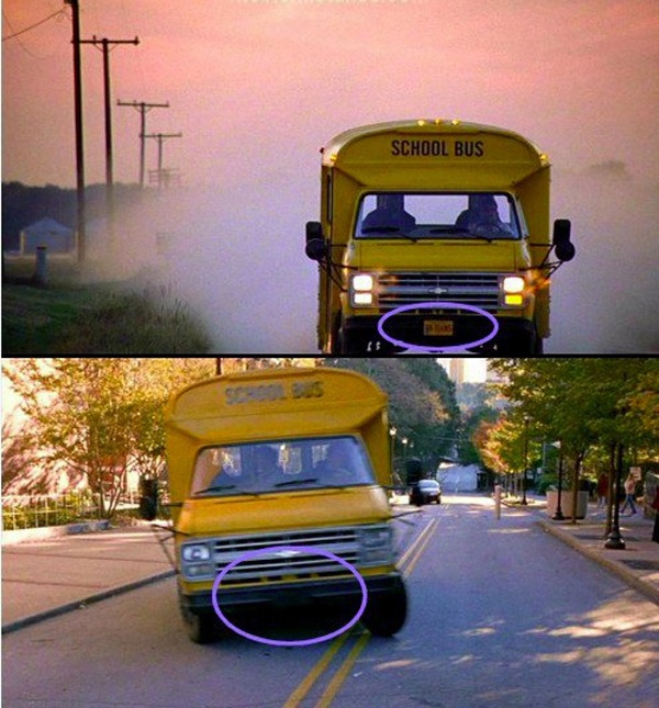 | Biển số của chiếc xe buýt chở học sinh trong bộ phim Road Trip (2000) sau một chặng đường đã “biến mất” trong khi bộ phim không hề nhắc đến chi tiết này, đây rõ ràng là một lỗi sơ suất của ê-kíp làm phim. |