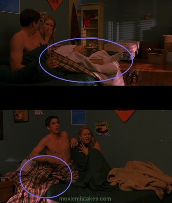 | Trong phần 2 American Pie 2 (2001), nhân vật Jim (Jason Biggs) và bạn gái đang làm “chuyện ấy” thì bị bố của Jim vào phòng bắt gặp. Anh chàng vội vàng ngồi dậy và kéo chăn che chắn. Ở cảnh trước, chân của Jim đặt lên chăn, cảnh sau anh đã “thò chân” vào lúc nào không hay. |