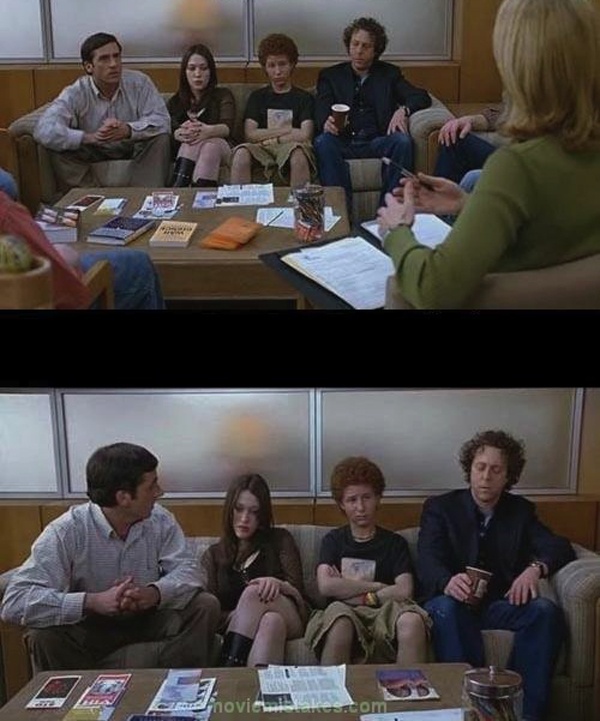 Phim hài người lớn The 40 Year Old Virgin (2005) có nhiều tình tiết gây cười cho người xem và nhận được phản hồi tích cực của giới chuyên môn nhưng vẫn mắc sai lầm ở việc sắp xếp bối cảnh. Trong ảnh, những đồ vật như tập giấy, tờ rơi, sách trên mặt bàn đã bị đổi lại vị trí.