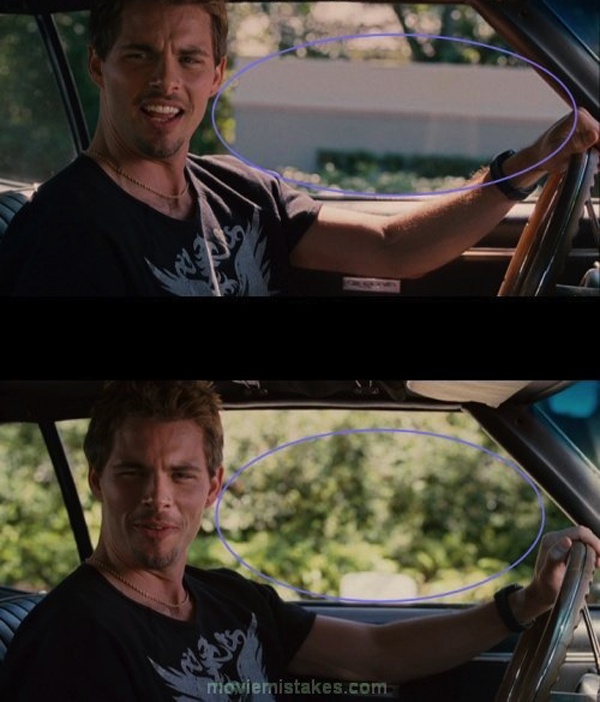 Sex Drive (2008) kể về nam sinh trung học Ian (Josh Zuckerman)lên đường gặp một cô gái mà anh quen trên mạng với mục đích để làm “chuyện ấy”. Đồng hành với nhân vật chính là anh bạn Rex (James Marsden). Khi Ian kể với Rex về ý định này, Rex đã mỉa mai bạn mình lúc đang ngồi trên xe. Bức ảnh cho thấy, khung cảnh bên ngoài xe ô tô của Rex đã bị thay đổi từ một tòa nhà thành bụi cây trong khi chiếc xe không hề di chuyển.