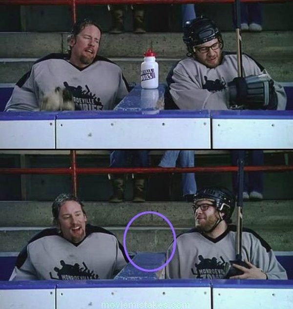 | Bộ phim Zack & Miri Make a Porno (2008) vấp phải hạt sạn khá to. Trong giờ nghỉ giải lao trận hockey, Zach (Seth Rogen) và Daecon (Jeff Anderson) đang nói chuyện, mở đầu cảnh là là một chai nước đặt giữa 2 người, nhưng sau đó, chai nước này không còn nữa. |