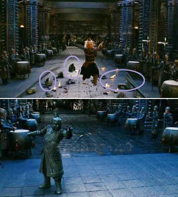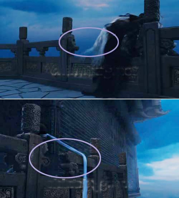 | Khi giao đấu với Túy Tiên Lỗ Ngạn, Bạch Phát ma nữ (Lý Băng Băng đóng) đã đánh gãy lan can thiên đình (ảnh trên). Tuy nhiên khi máy quay hướng ngược lại, lan can chỉ gãy phân nửa (ảnh dưới).  |