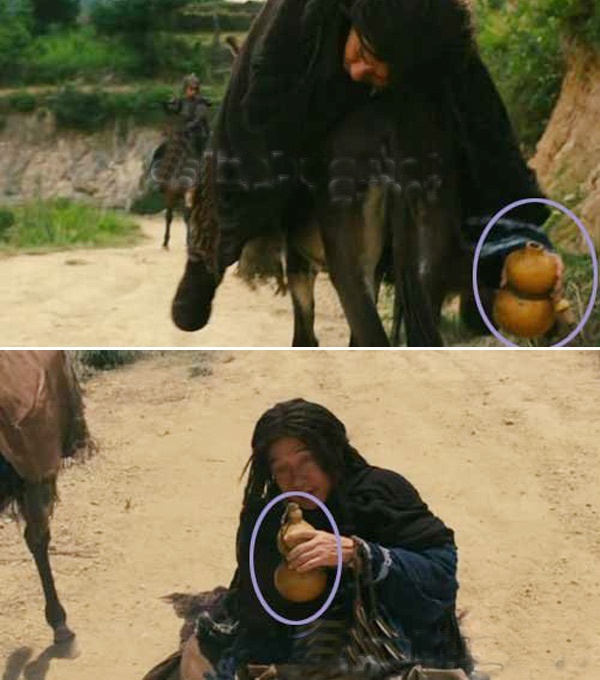 Khi nằm trên lưng ngựa, Túy Tiên Lỗ Ngạn (Thành Long đóng) tay cầm bình rượu đã mở nắp nhưng khi xuống ngựa, chiếc bình lại đậy nắp.