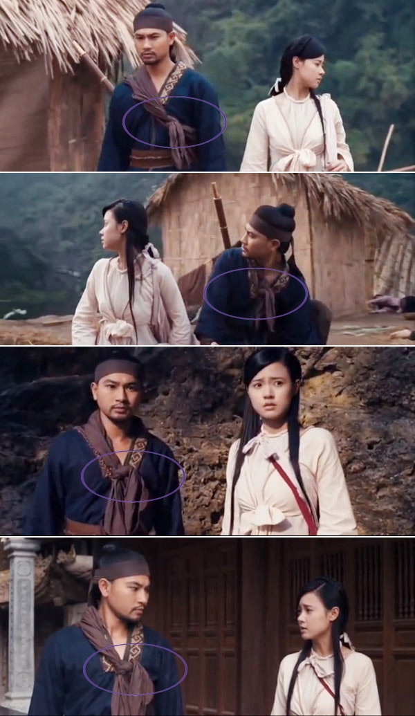 Gút thắt chiếc bị Hoa Xuân đeo mỗi lúc một khác dù vẫn ở một phân cảnh.