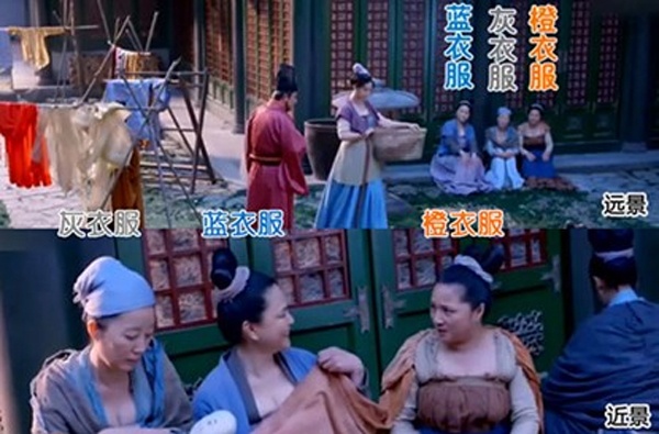 | Cảnh phim Võ Mỵ Nương bị phái tới tiết đình giặt quần áo, lúc đầu có ba phụ nữ tuần tự mang trang phục áo màu lam, xám và cam. Một lúc sau khi đến cảnh quay cận cảnh, vị trí ba phụ nữ đã bị thay đổi trở thành xám, lam và cam. |