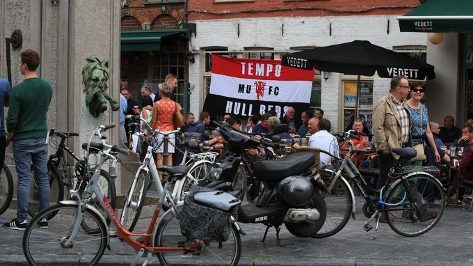 | Các fan M.U có mặt tại Brugge để cổ vũ cho đội nhà. Ảnh: ITV. |