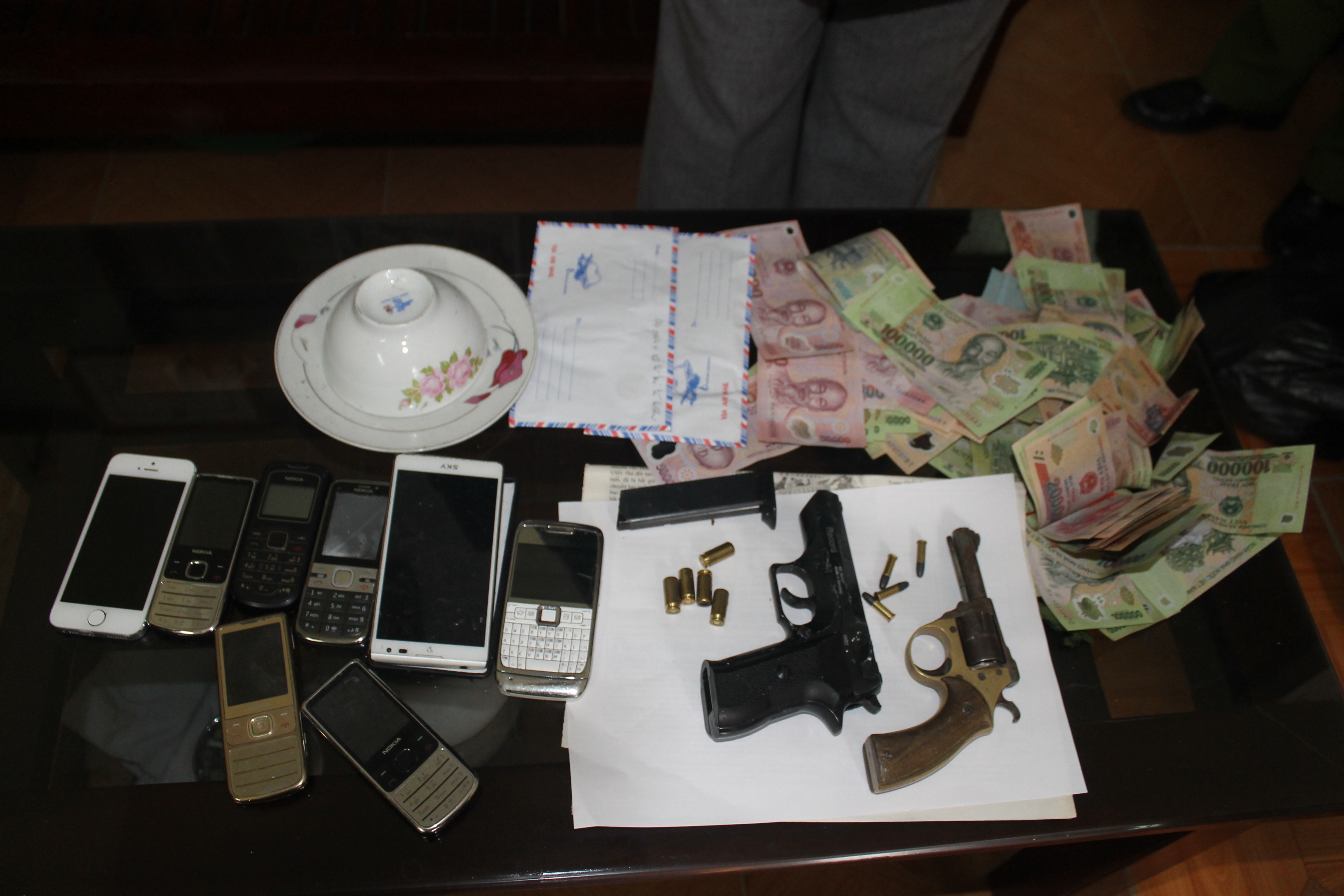 Tang vật thu giữ dưới chiếu bạc hơn 5 triệu đồng, bộ bát đĩa, 20 điện thoại, hơn chục xe máy...