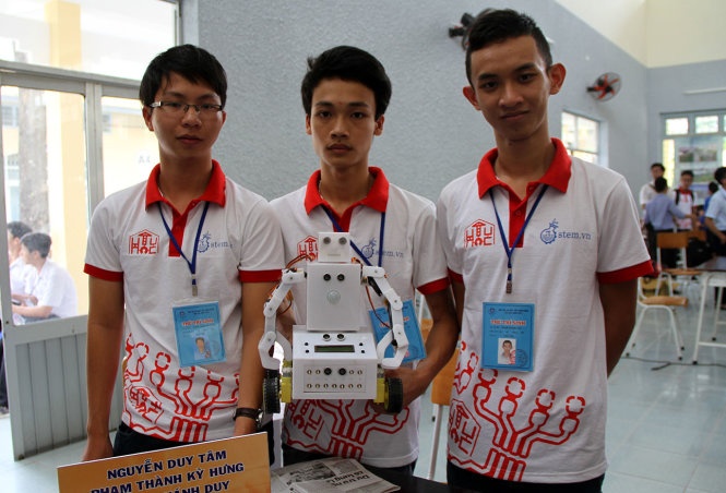Đến từ Phú Yên, ba cậu học trò Nguyễn Duy Tâm, Phạm Khánh Duy (lớp 12 Trường THPT Nguyễn Huệ) và Phạm Thành Kỳ Hưng (lớp 12 Trường THPT Duy Tân) với sản phẩm: “T-res robot thông minh phục vụ học tập” đã xuất sắc giành giải nhất phần thi lập trình phần cứng dành cho khối học sinh THPT.