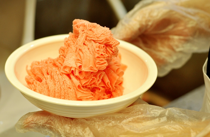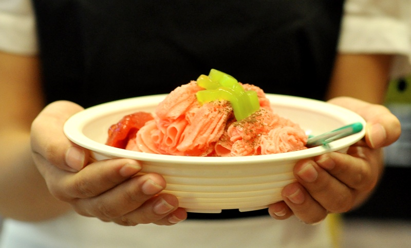 Quả thật, kem tại đây khác biệt hoàn toàn so với các tiệm ở Hà Nội. Kem có nhiều hương vị với các màu sắc khác nhau, được để thành tảng to tròn trong tủ đá. Mỗi khi khách gọi, nhân viên sẽ lấy ra đặt vào một chiếc máy xinh xắn để bào thành những dải kem xếp thành tầng tầng lớp lớp uốn lượn đẹp mắt. Có người nhìn bảo: “Trông cứ như lụa hay giấy gấp nếp vậy”. Quả nhiên, đây không phải loại kem mềm mịn phổ biến mà mọi người hay ăn. Nhân viên quán cho biết, đó là dạng kem tuyết, khi ăn có cảm giác mát lạnh hơn và không quá ngọt. Kem tuyết cũng lâu tan chảy, có lẽ nhờ thế mới tạo hình thành dải như vậy.