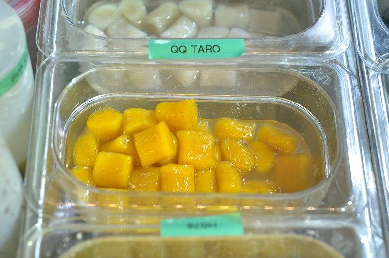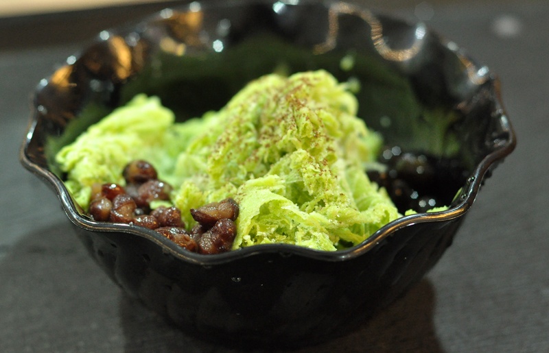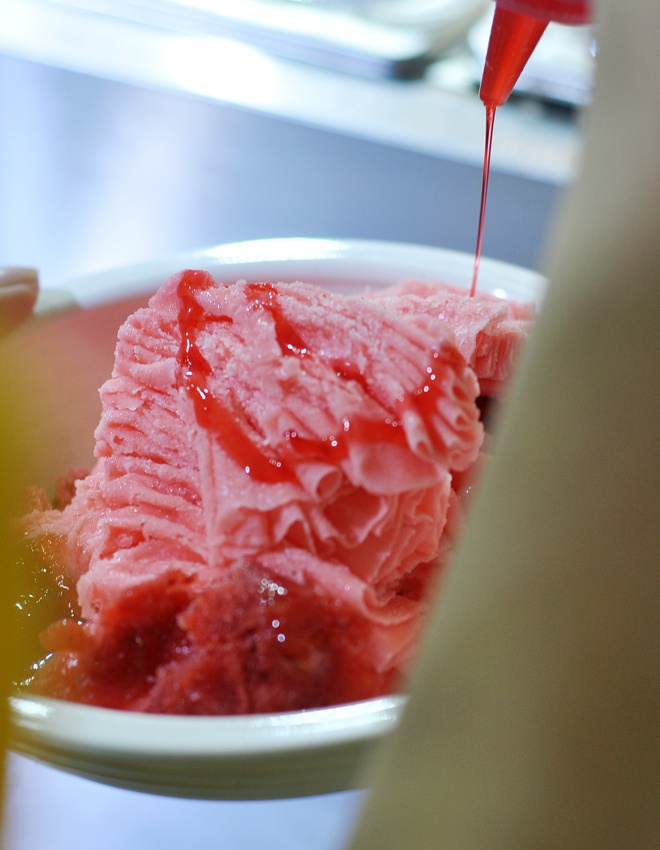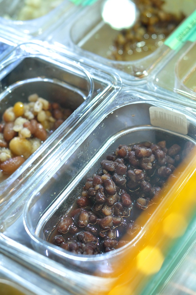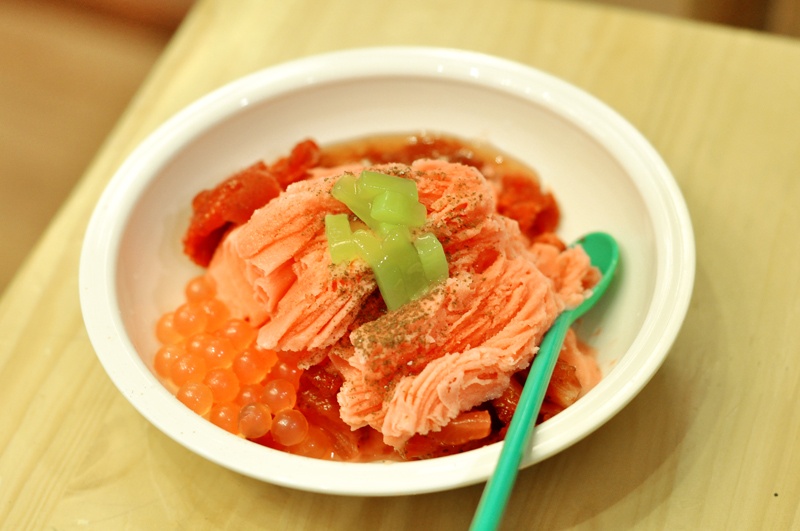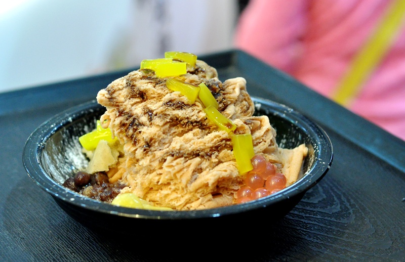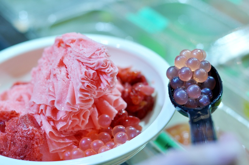 Kem Nhật cũng phủ thêm topping lên trên. Topping khá lạ, ngoài sirô, nước sốt hay các loại hoa quả xắt nhỏ thì còn có khoai lang, đậu xanh, đậu đỏ… và đặc biệt là những viên trân châu nổ. Chúng không chỉ óng ả hệt như trân châu thật mà khi nhai nổ tanh tách trong miệng, vỡ ra vị dâu, xoài, táo… rất thú vị.