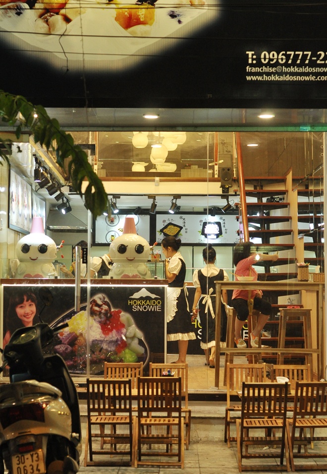 Mới thoạt nhìn, nhiều người chưa phán đoán được quán phục vụ món gì. Chỉ biết tên quán có vẻ “made in Japan” - Hokkaido Snowie, không gian thiết kế đẹp, cửa kính, đèn điện sáng trưng, nhân viên mặc váy đồng phục như trong truyện tranh Nhật Bản… Mạnh dạn hỏi bạn sẽ biết nơi đây là một thương hiệu kem Nhật mới lạ, lần đầu tiên có mặt ở Việt Nam.